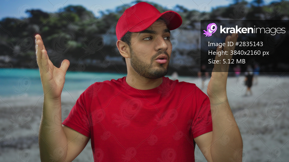 Courier man in red cap and t shirt shrugs hands and raises eyebrows in a studio setting; uncertainty frustration.