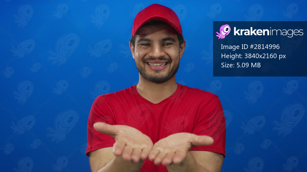 Courier man wearing a red cap and t shirt with open palms offering gesture in a blue studio; assistance.