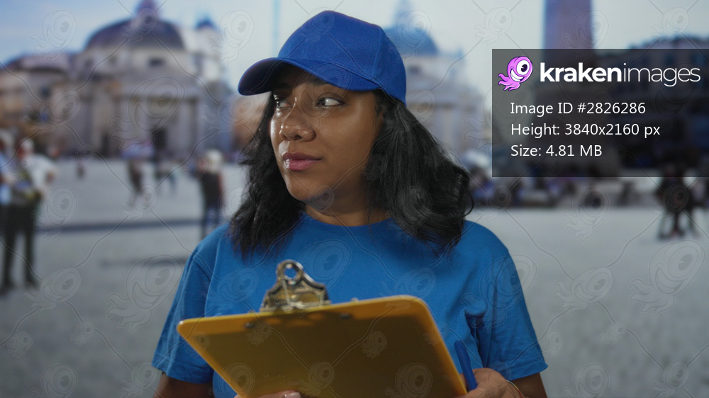 Courier woman in blue cap and shirt writing on clipboard on street outside building with pen and focused gaze; duty.