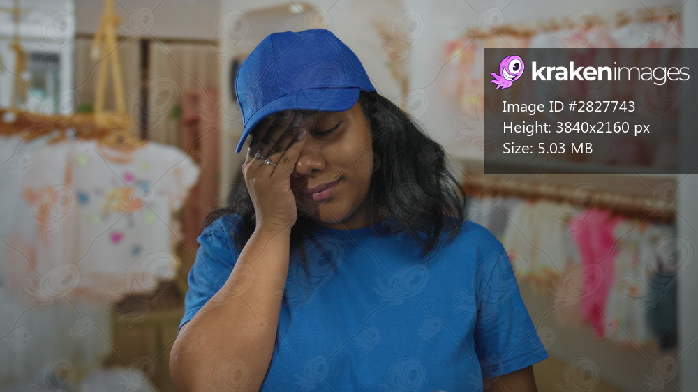 Courier woman touches forehead while holding clipboard near racks inside building; weariness stress.