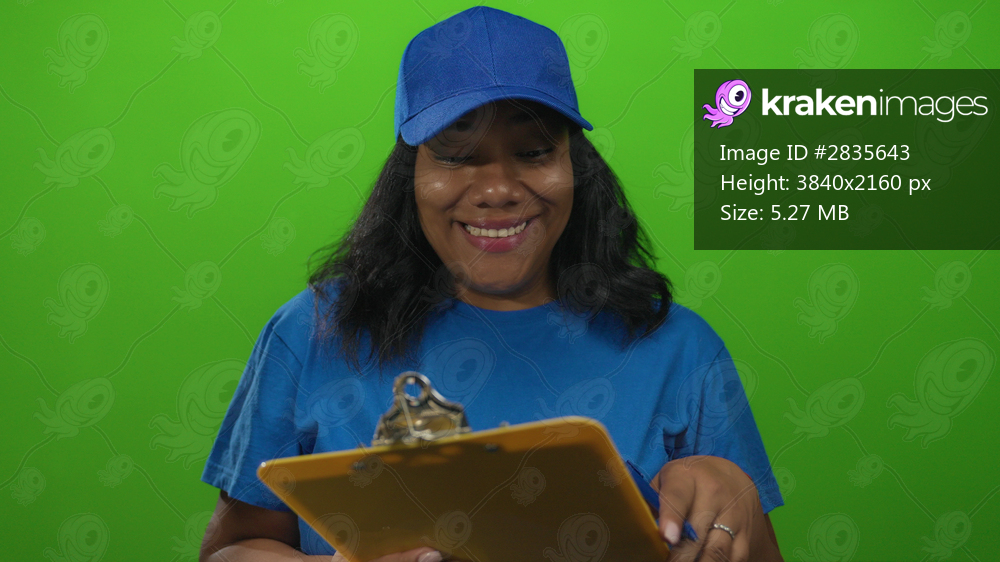 Courier woman writes delivery details on a clipboard in studio; efficiency and professionalism define the service.
