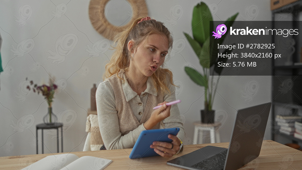 Creative woman navigates a tablet calling clients from home via video call beside a desk equipped with stylus and laptop near her blonde ponytail.