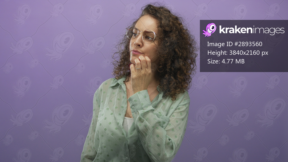 Curly haired hispanic young woman touching chin in studio with lavender backdrop wearing sheer green polka dot blouse and glasses; thoughtful introspection. - Kraken Images