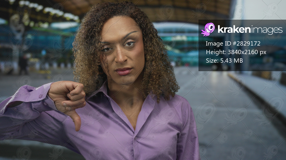 Curly haired transgender woman in purple shirt giving thumbs down gesture at airport terminal walkway; disapproval.