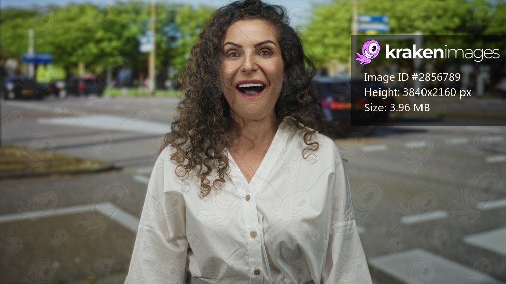 Curlyhaired woman wearing white blouse with raised hands and open mouth in street; unexpected amazement.