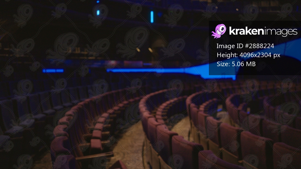 Curved auditorium seats in soft bokeh interior with moody blue stage lighting and shallow focus; background copyspace backplate template.