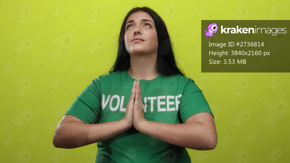 Curvy volunteer woman meditating against isolated yellow wall background, symbolizing peace and mindfulness.