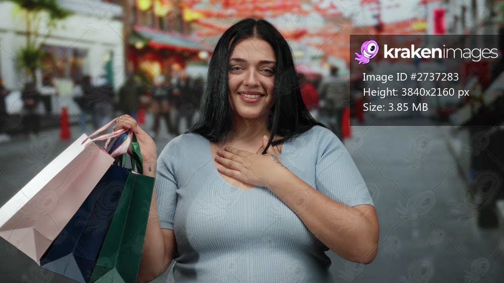 Curvy woman smiling with shopping bags on busy city street, vibrant outdoor scene emphasizing urban lifestyle and diversity in modern culture