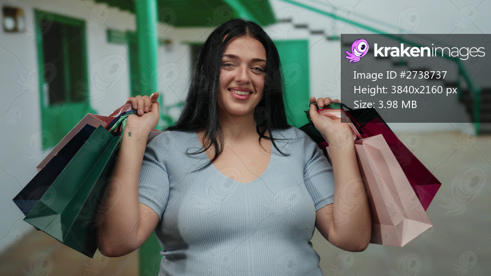 Curvy woman smiling while holding colorful shopping bags on a city street, showcasing her plus size fashion style in an outdoor setting.