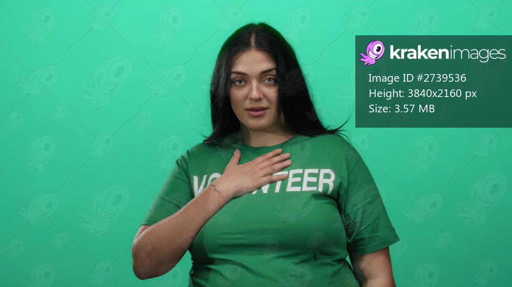 Curvy woman volunteer in green shirt stands over isolated green background wall, embodying commitment and community service.