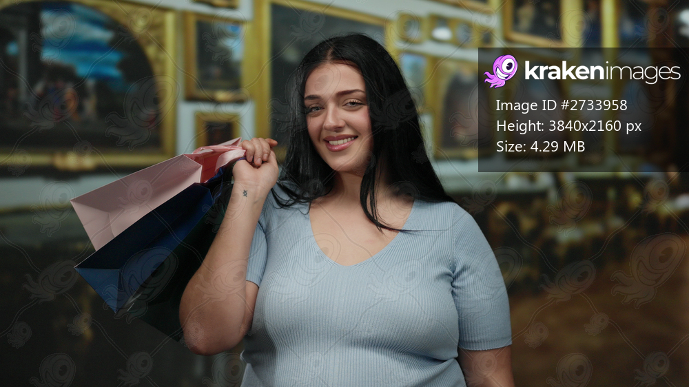 Curvy young woman happily holding shopping bags in a museum with elegant decor indoors.