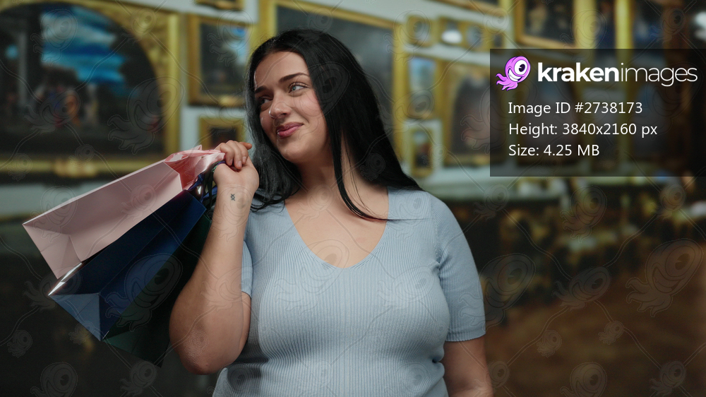 Curvy young woman happily holding shopping bags in a museum with elegant decor indoors.