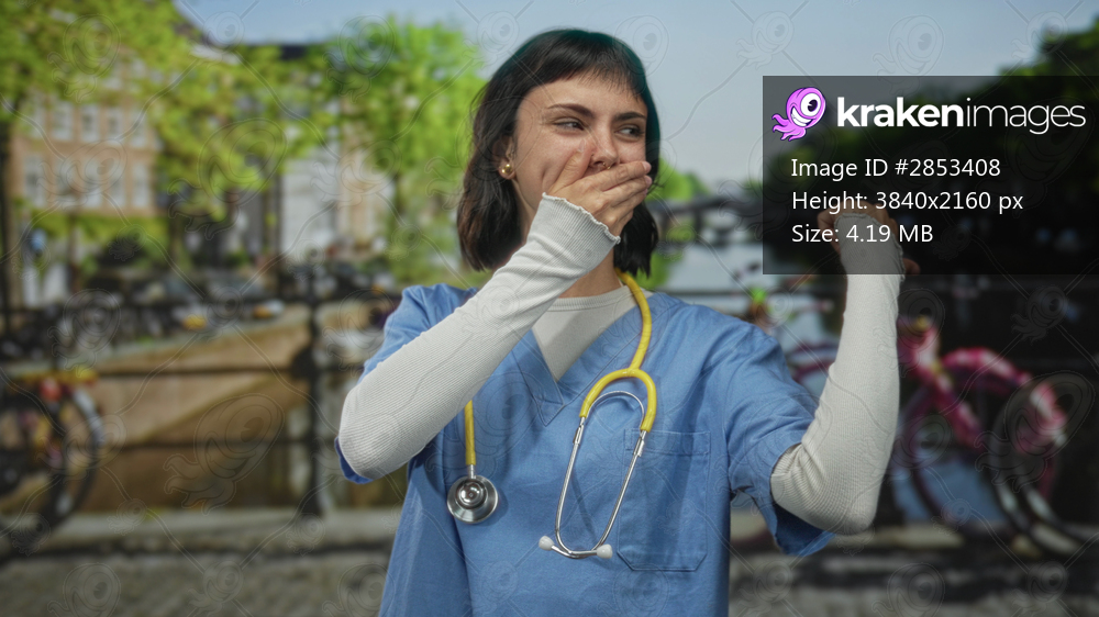 Dedicated woman nurse in blue scrubs with stethoscope covers her mouth on a street in amsterdam; confidence.