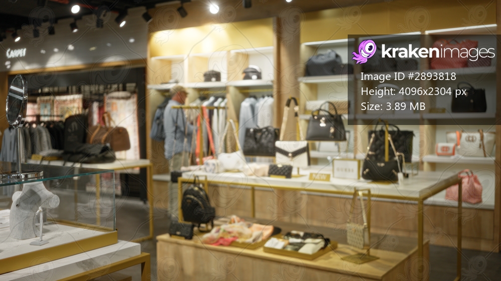 Defocused boutique shop showing blurred handbag displays, shelves and glass counters with soft bokeh lighting; background copyspace backplate.