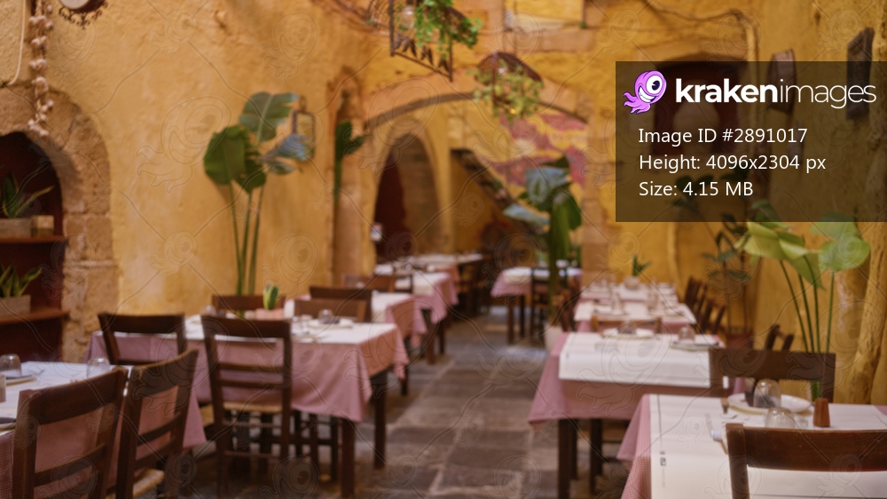 Defocused cafe interior with warm ochre textured walls and out of focus tables and chairs in a shallow bokeh corridor; background backdrop copyspace calm. - Kraken Images