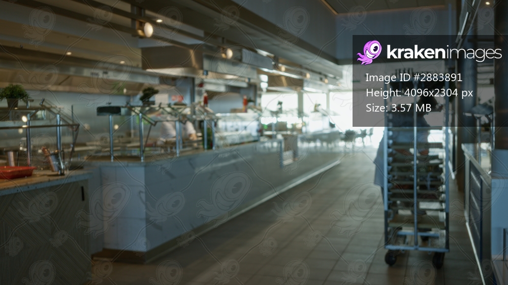 Defocused cafeteria serving line interior with blurred counters, stainless kitchen racks and service cart in soft bokeh; background backdrop copyspace calm. - Kraken Images