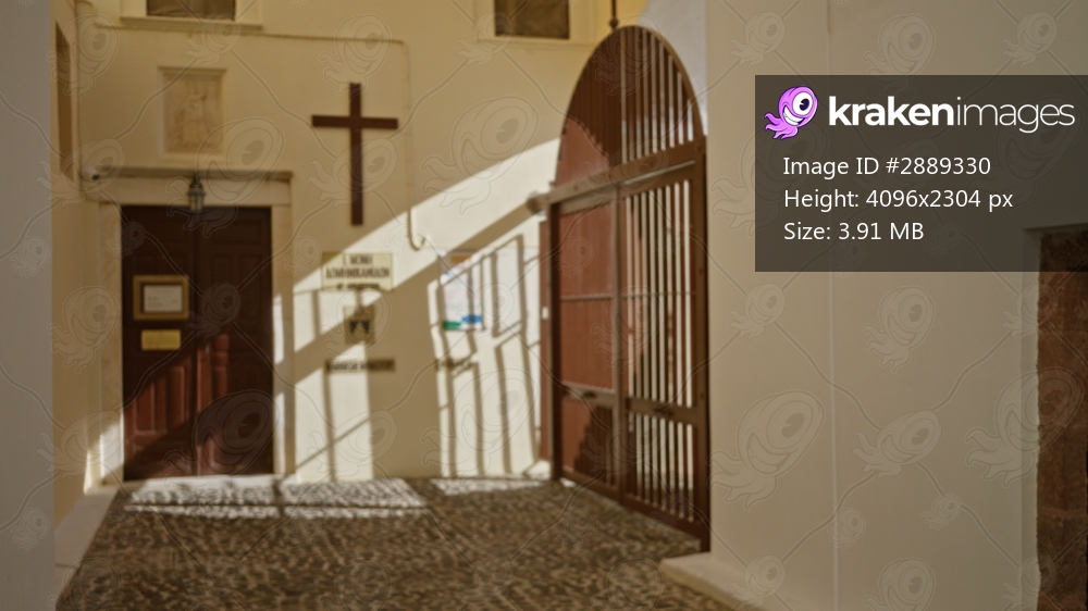 Defocused church corridor with sunlit gate, wooden door and cobblestone floor in warm tones; background backplate copyspace.