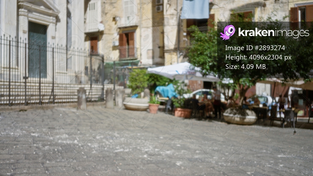 Defocused city plaza scene with cobblestone pavement, potted plants and cafe umbrellas in soft bokeh; background backdrop copyspace calm.
