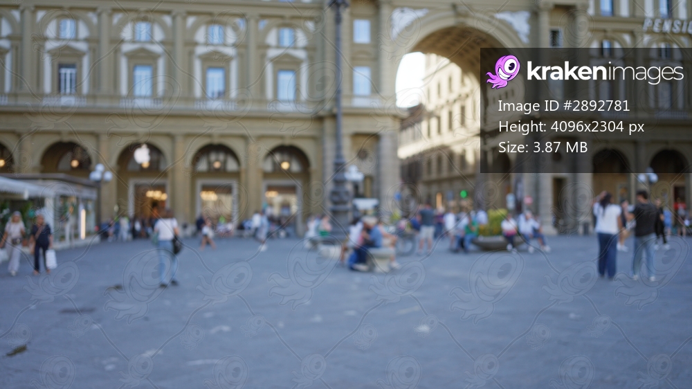 Defocused city square with soft bokeh and historic arcaded facade, outdoor plaza framed by arches, lampposts and stone pavement; background backdrop copyspace template. - Kraken Images