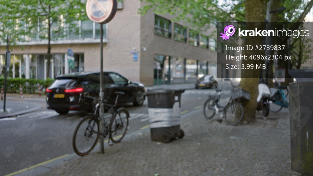 Defocused cityscape showcasing a street with bicycles, parked black car with european license plate, trees, and buildings, capturing an urban european atmosphere. - Kraken Images
