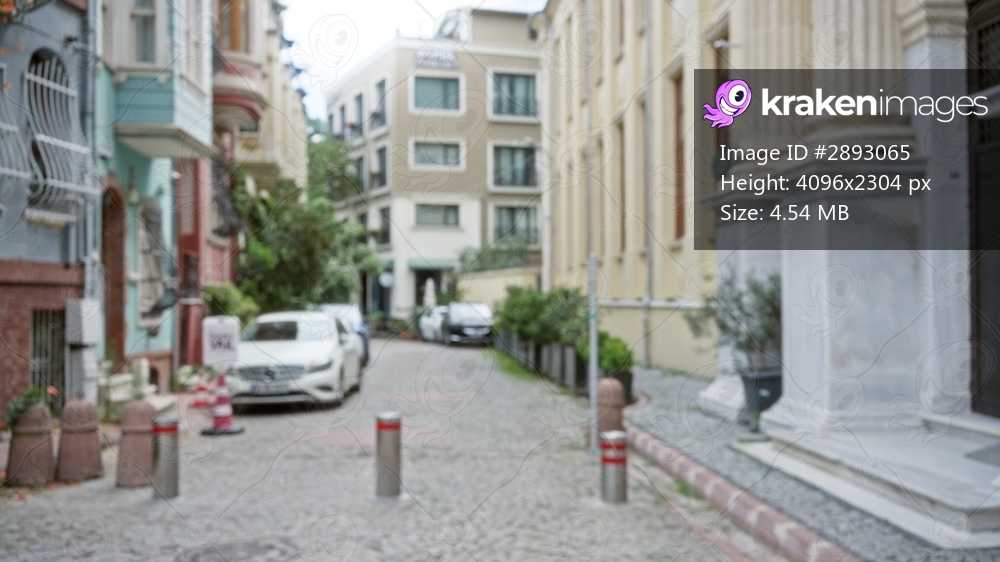 Defocused cobblestone city street with soft bokeh and muted pastel facades; background copyspace backplate calm.