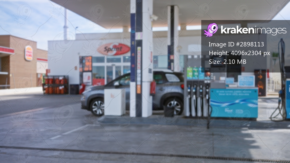 Defocused gas station forecourt with fuel pumps, canopy and parked car, station; background backdrop copyspace.