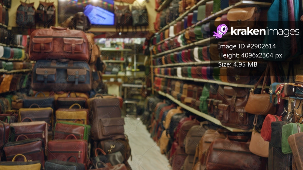 Defocused leather bag display and stacked backpacks in a blurred shop aisle interior; background backplate template calm.