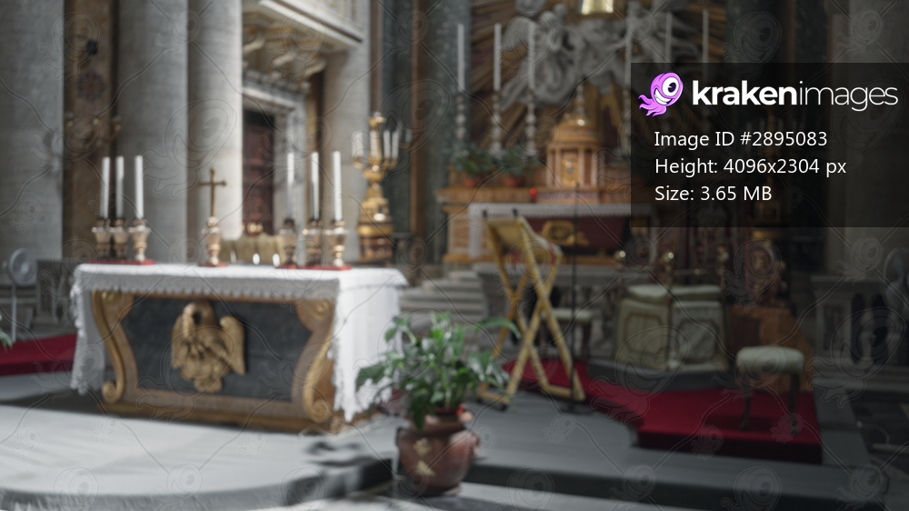Defocused ornate catholic church altar interior with soft bokeh and shallow focus background; background backplate copyspace calm.