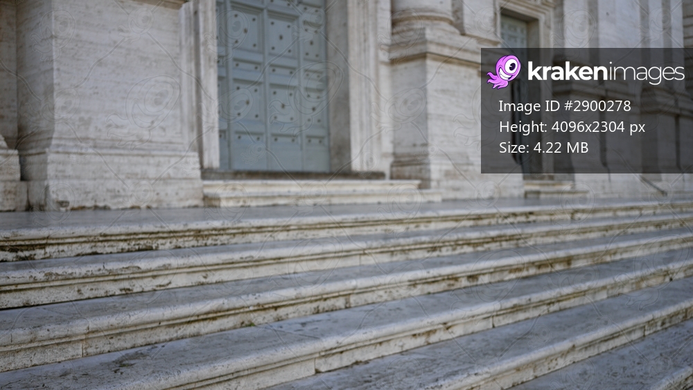 Defocused pale stone steps leading to a classical carved facade and door in shallow focus, church; background backplate copyspace calm.