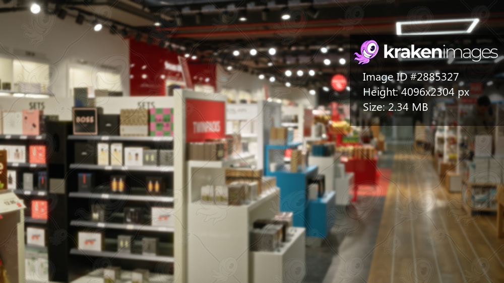 Defocused retail shop interior with soft bokeh and blurred product shelving and aisles; background backdrop copyspace template.