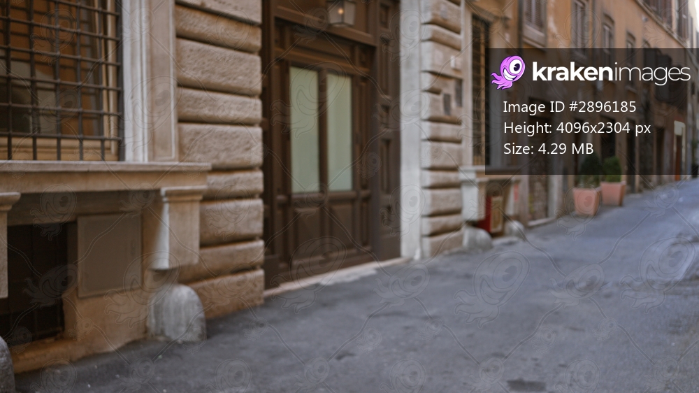 Defocused roman street with blurred facades, doors and pavement in shallow focus; backdrop copyspace calm.