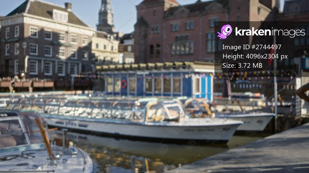 Defocused scene of amsterdam canals with boats and historic buildings in bright sunlight showcasing dutch architecture and waterfront life.