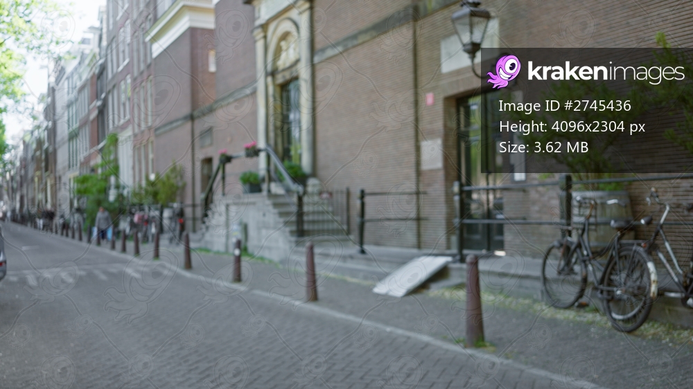 Defocused street scene in a european city with bicycles and historic architecture, featuring a blurred view of people walking along a cobblestone road with brick buildings. - Kraken Images
