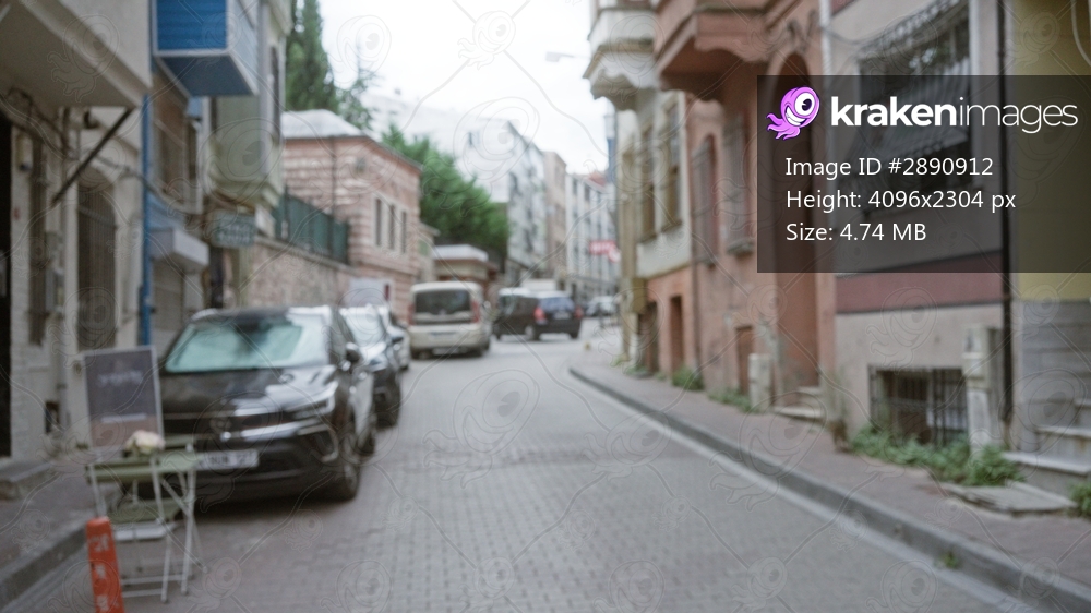 Defocused street scene with soft bokeh, parked cars and muted building facades, street; background backdrop copyspace calm.