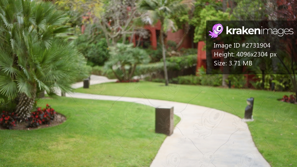 Defocused tropical resort path with lush greenery and palm trees creating a serene luxury atmosphere in an outdoor hotel setting.