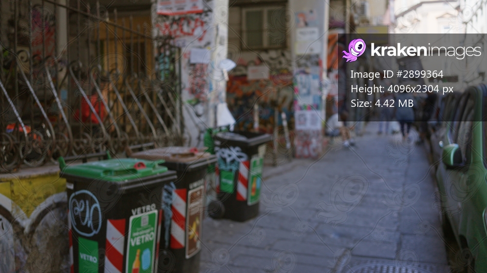 Defocused urban street scene with blurred trash bins, graffiti covered walls and parked cars in shallow focus street; background backdrop copyspace calm. - Kraken Images