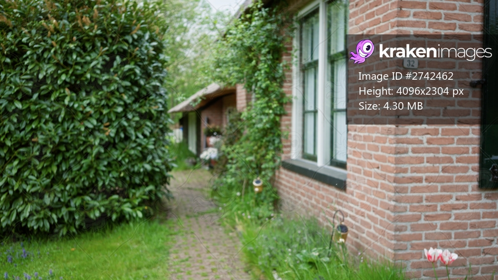 Defocused view of a charming house exterior with red brick wall partially covered in lush green leaves and bokeh showing a cozy garden path leading to a distant shed. - Kraken Images
