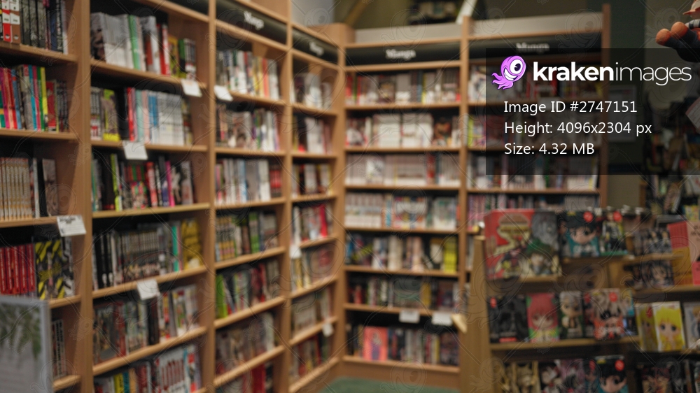 Defocused view of a cozy library filled with colorful manga books on wooden shelves, creating a vibrant and inviting atmosphere for manga enthusiasts.