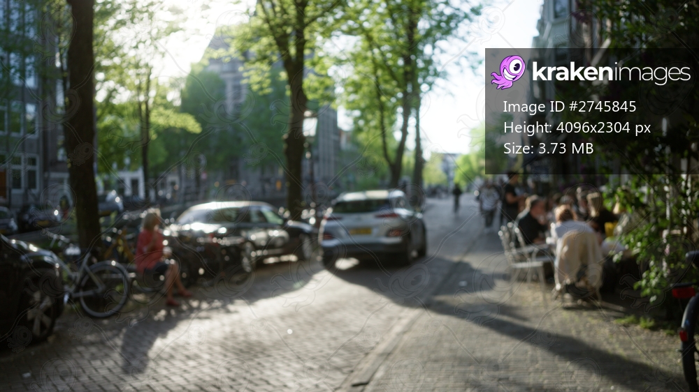 Defocused view of a european city street with blurred pedestrians and cars, capturing a sunny afternoon ambiance in an outdoor cafe setting with trees lining the avenue.