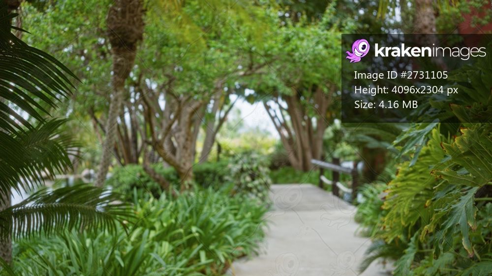 Defocused view of a lush tropical garden path at a luxury resort surrounded by green foliage and trees, providing a serene and tranquil outdoor atmosphere. - Kraken Images