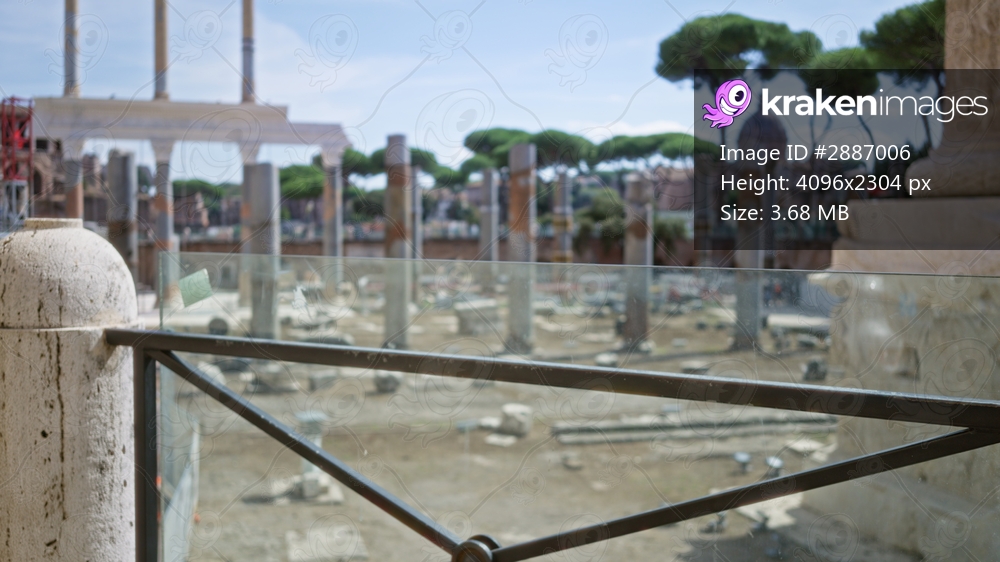 Defocused view of ancient roman forum with shallow bokeh and stone railing in foreground, outdoor; background backdrop template.