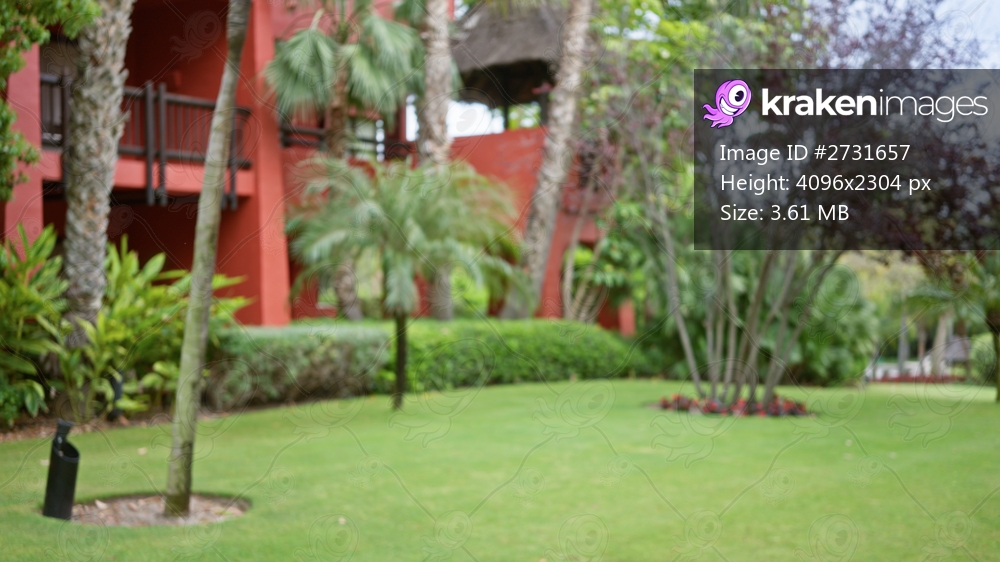 Defocused view of lush tropical garden at luxury hotel resort with blurred palm trees and vibrant greenery creating serene outdoor atmosphere perfect for relaxation and leisure. - Kraken Images