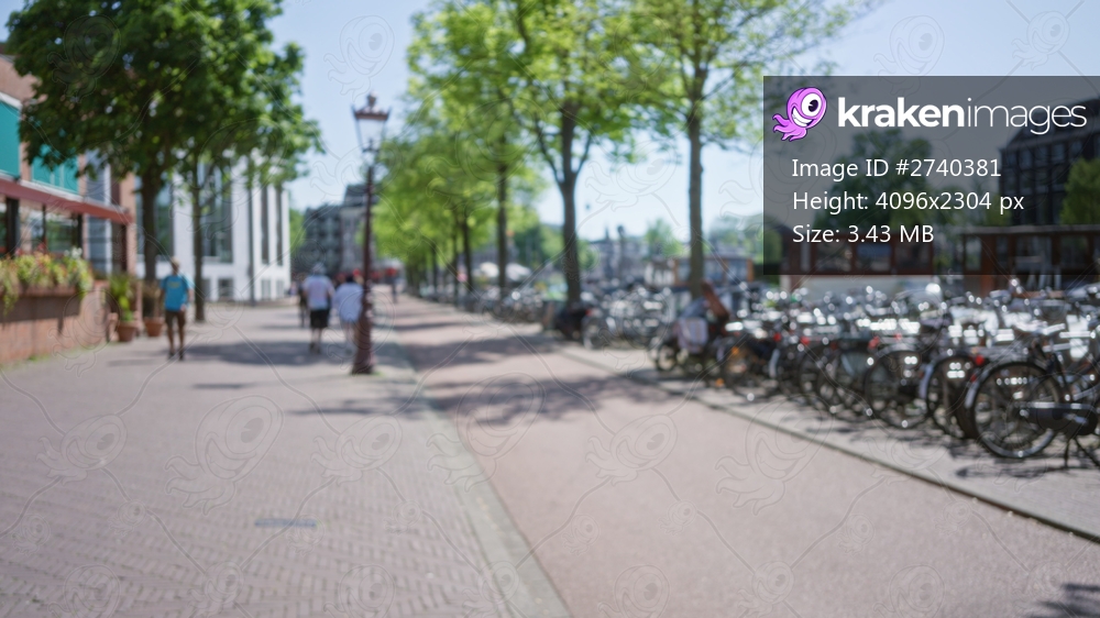 Defocused view of people walking along a tree-lined street in amsterdam with bicycles parked nearby, showcasing urban life in a vibrant city setting.
