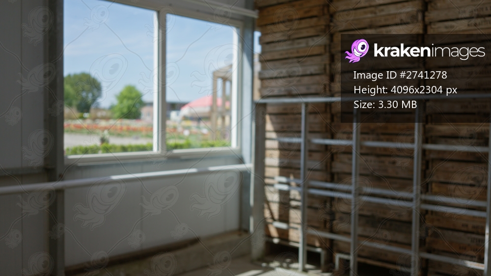 Defocused view through factory window showing blurred outdoor garden and stacked crates inside industrial setting enhancing contrast.