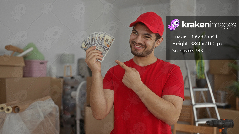 Delivery courier man counting cash fan while smiling in building filled with cardboard moving boxes; financial achievement pride.