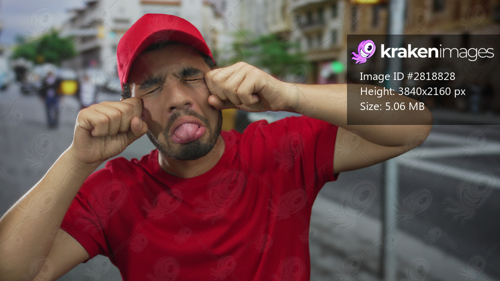 Delivery courier man wearing bright red cap and matching shirt rubbing eyes in busy street; sadness.