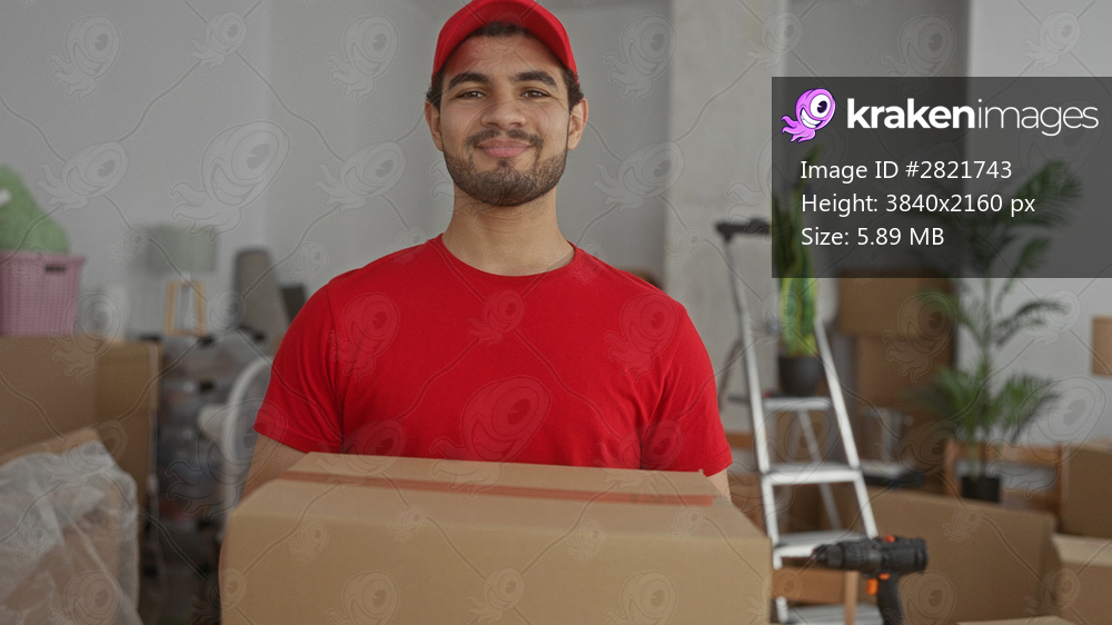 Delivery man holds cardboard box with bare forearms in a newly built home building; trust service reliability support.
