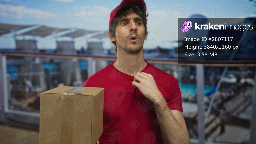 Delivery man in red cap holds cardboard box and touches shirt collar on cruise deck; uncertainty.