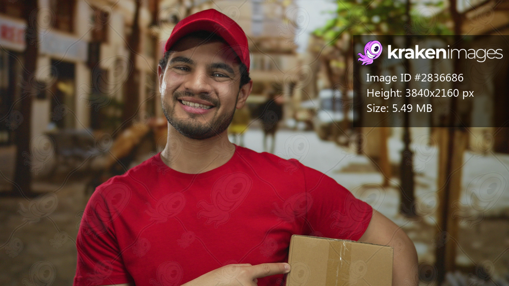 Delivery man in red uniform points finger to package on city street; friendly reliability service quality.