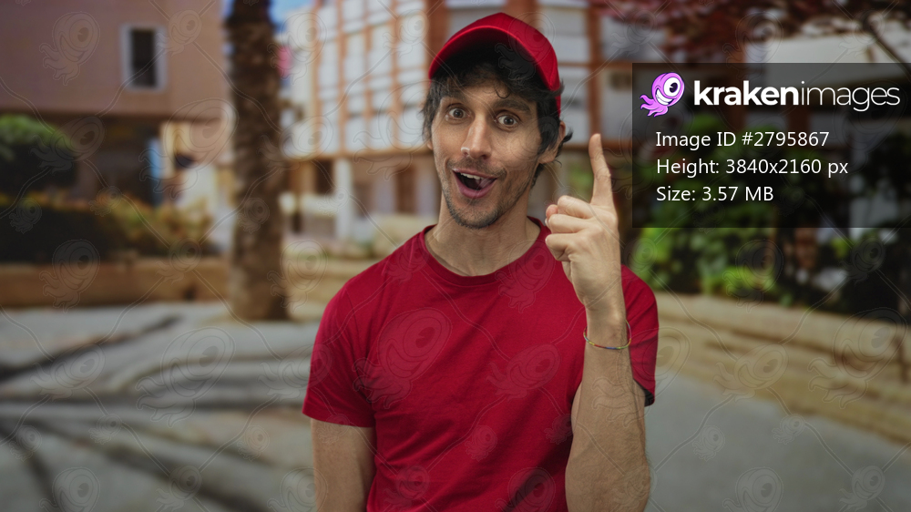 Delivery man with red cap pointing finger upward on busy city street with open mouth expression; surprise curiosity insight focus.